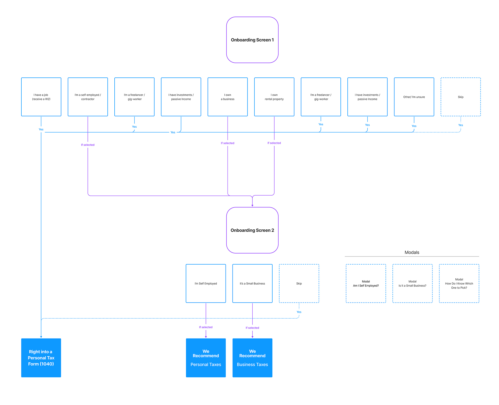 During this phase, we focused on creating the least amount of questions needed to understand the user's situation and recommend business or personal taxes.